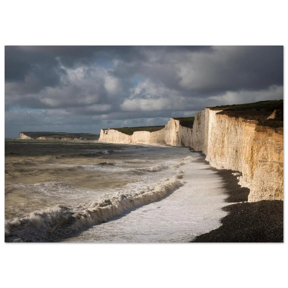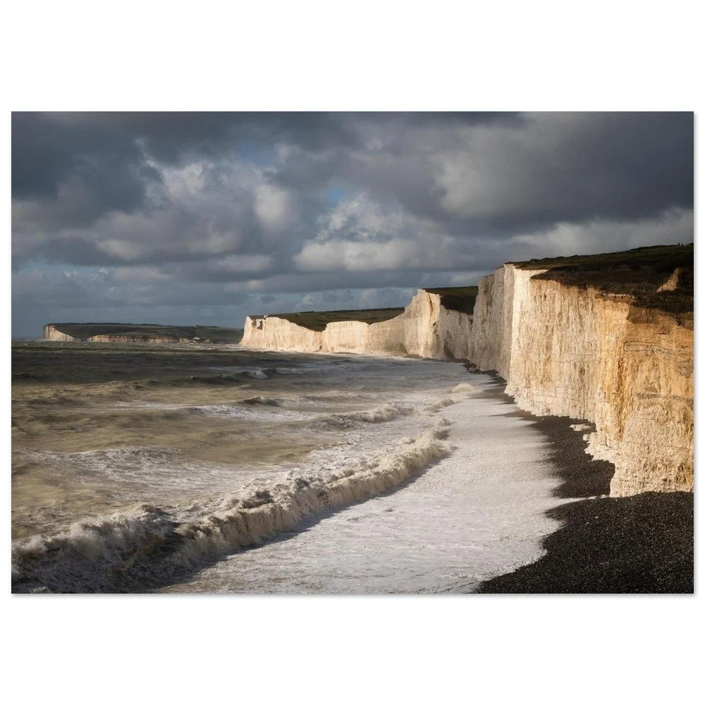 Late-afternoon sunlight breaks through storm clouds to illuminate the chalk cliffs of Birling Gap and the Seven Sisters. The waves curve toward the shore beneath a turbulent sky, the warm cliff face standing out against the cool green sea.