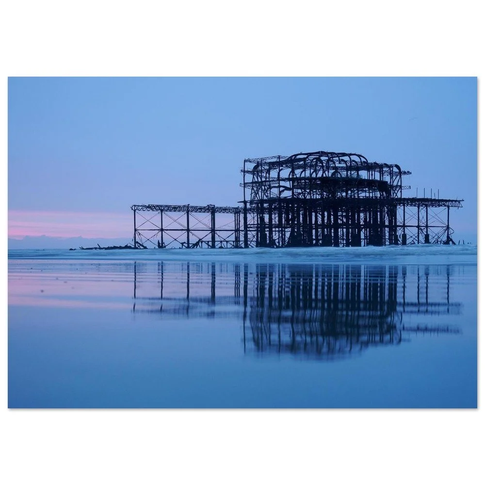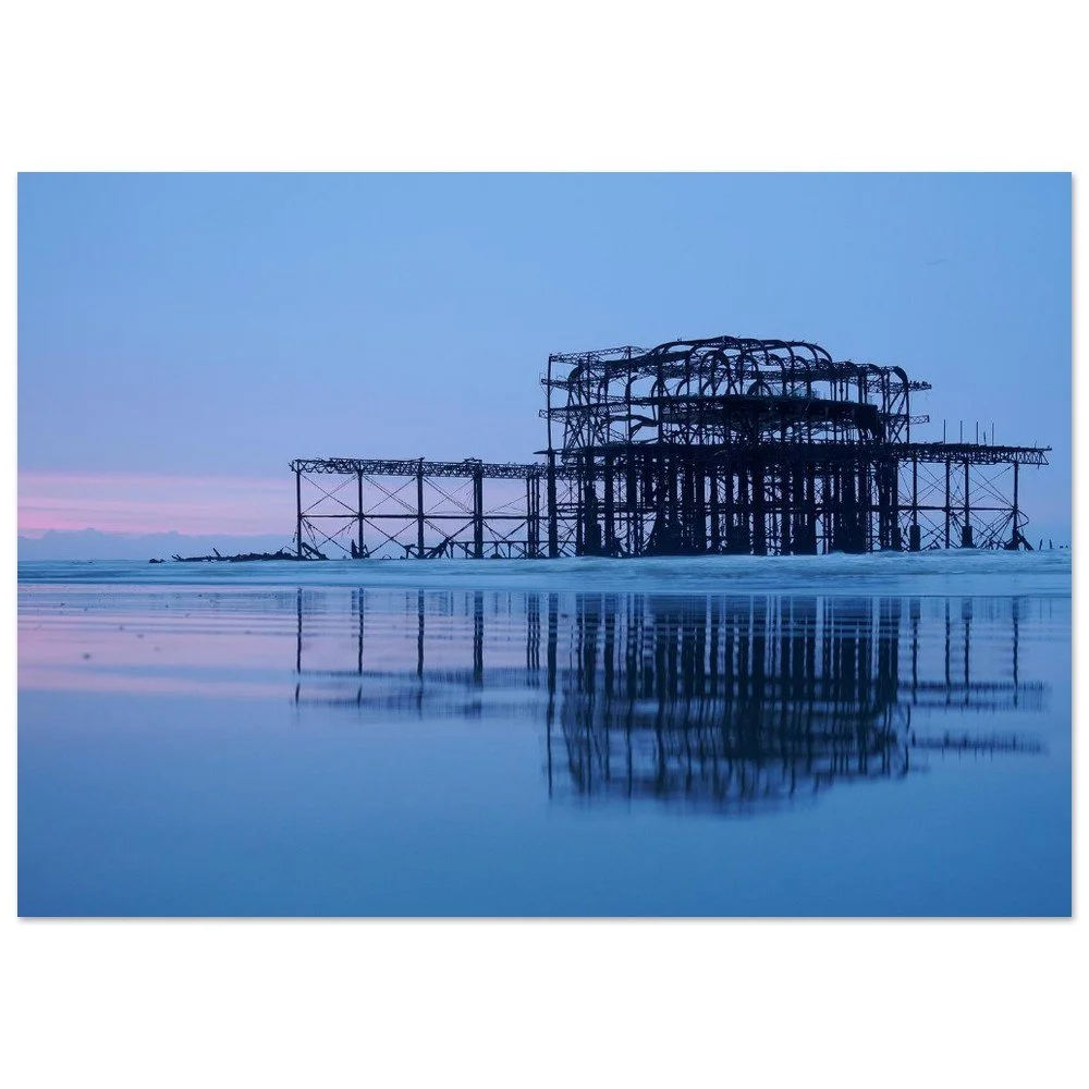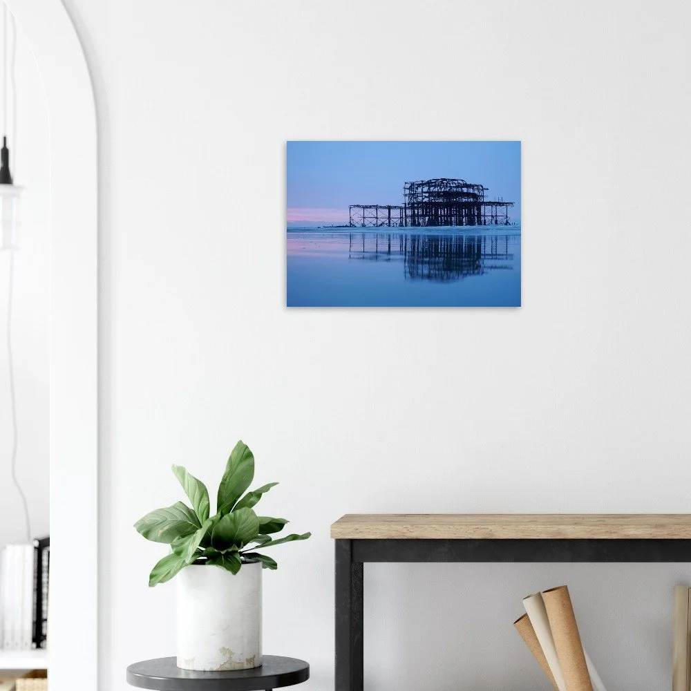 The remains of Brighton’s West Pier extend into the sea, silhouetted against shifting light and sky. The skeletal structure draws the eye outward across water and horizon, a study of form, decay, and coastal atmosphere that brings a sense of space and quiet drama to a room.